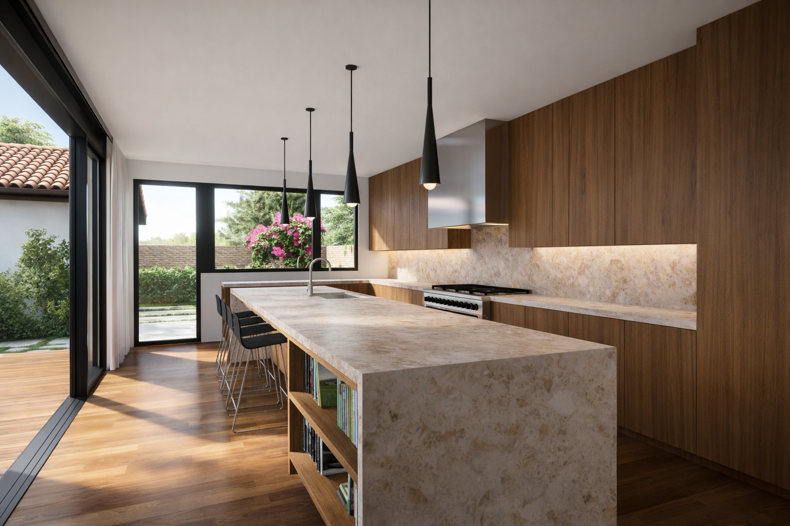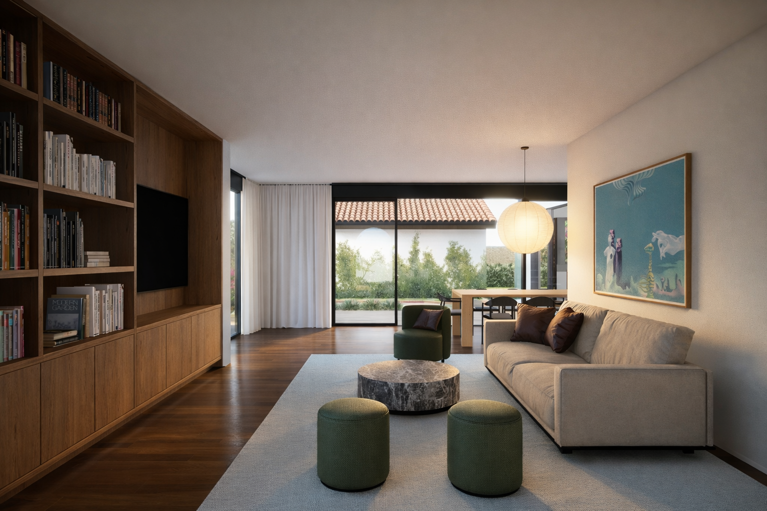 Near the community playground and situated on a quiet street, corner lot, framing Baldwin Hills rising above neighbor's houses beyond, the owner returns to the neighborhood they were raised to establish a family sanctuary of warm daylighting, wood, soft curves and communal spaces indoor and out on a modest plot. Construction underway with completion expected in winter 2026